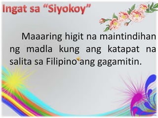 1mailahad ang uri ng balabaybayan at tuntunin nito2maibigay ang maikling kaalaman hinggil sa filipino bilang wikang pambansa3matutukoy ang mga makabagong alpabetong filipino 4maisa isa ang mga gabay tungo sa ortograpiyang filipino5mabigyang kahulugan ang pantig at pagpapantig. Ay pambansang timpalak sa pagbaybay sa wikang Filipino na batay sa mga umiiral na tuntunin ng Ortograpiyang Pambansa at Manwal sa Masinop ng Pagsulat. Ang Ortograpiyang Filipino ay tumutukoy sa mga tuntunin kung paano sumulat nang wasto sa wikang Filipino.